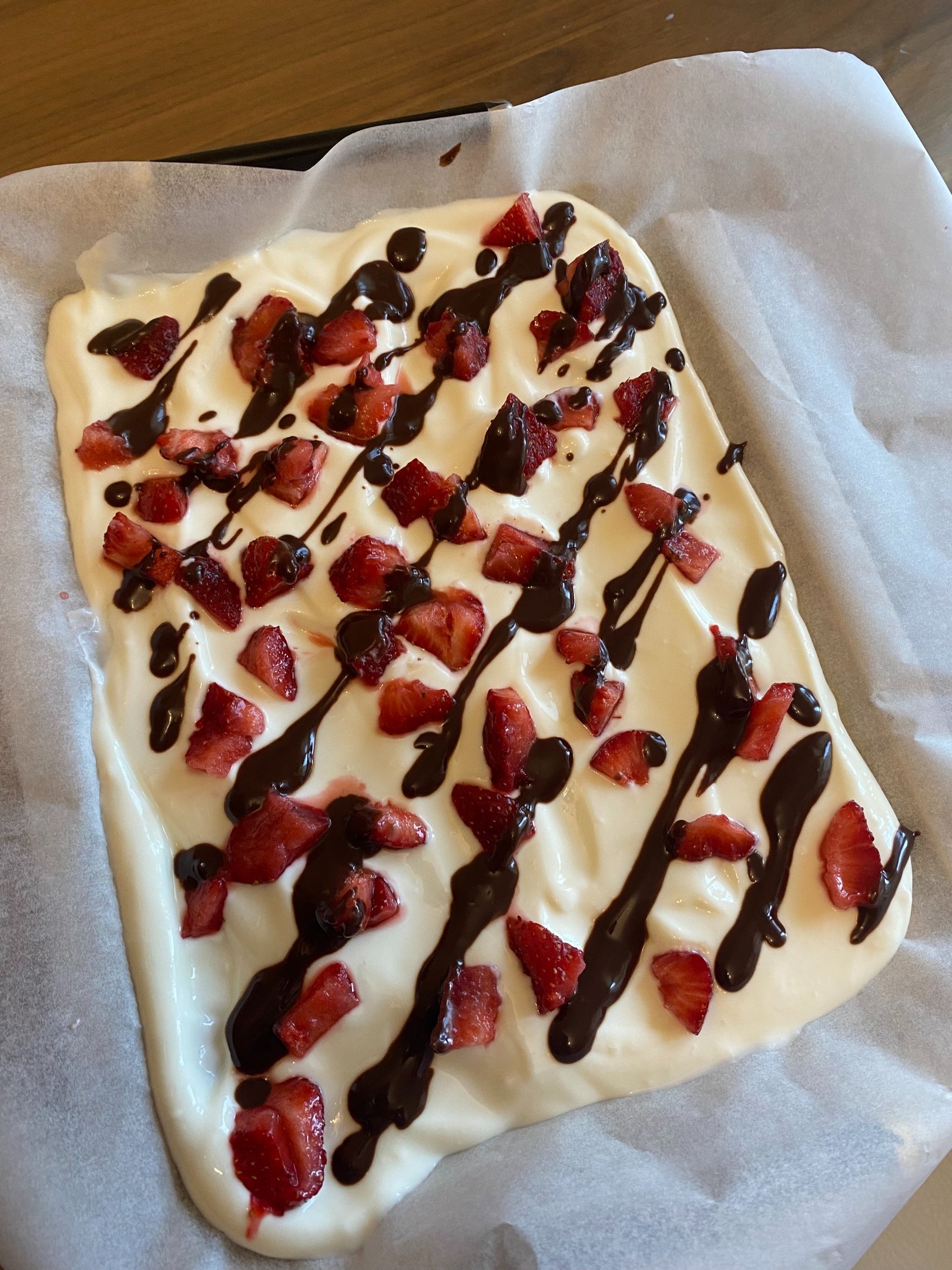 Spread the base: Pour the Greek yogurt onto the parchment paper and spread it evenly into a rectangle (about 1/2 inch thick).